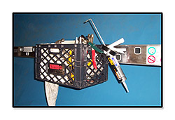 Logical product to hold slip sheets for fiber cement siding, battery drills, nails, towels, lunches, caulking, U-Nam-It. Slides for convenience.